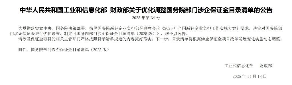 工信部 财政部关于优化调整国务院部门涉企保证金目录清单的公告