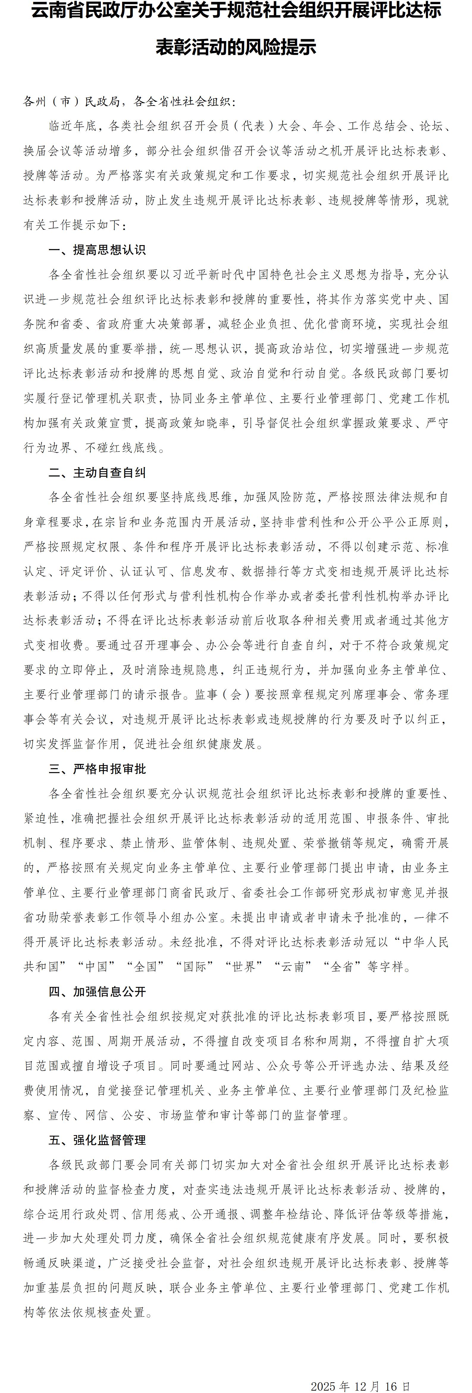 云南省民政厅办公室关于规范社会组织开展评比达标表彰活动的风险提示