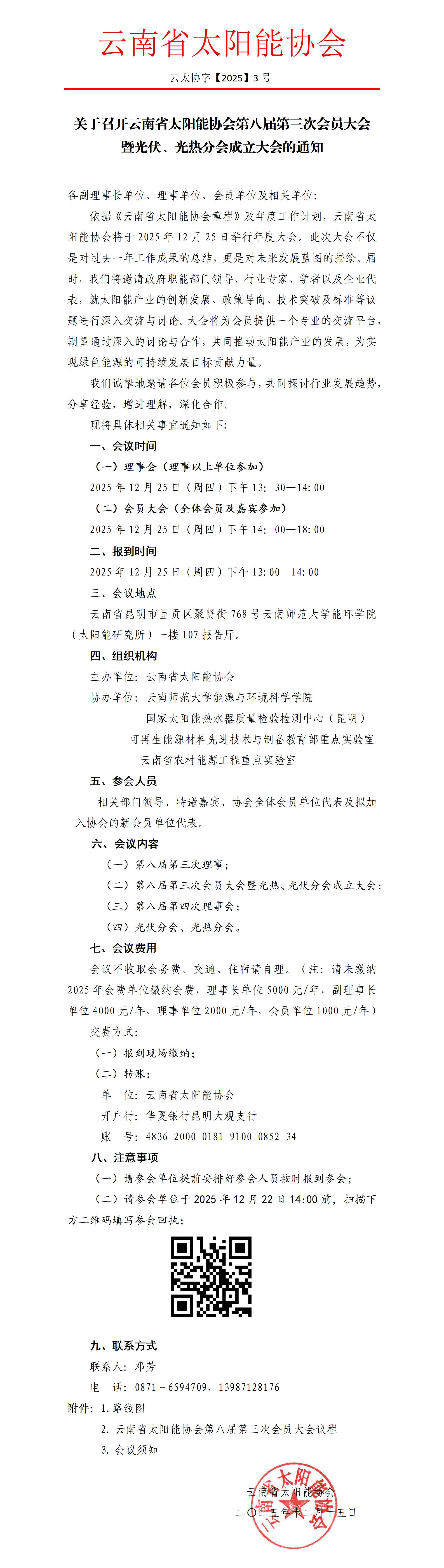 关于召开云南省太阳能协会第八届第三次会员大会暨光伏、光热分会成立大会的通知