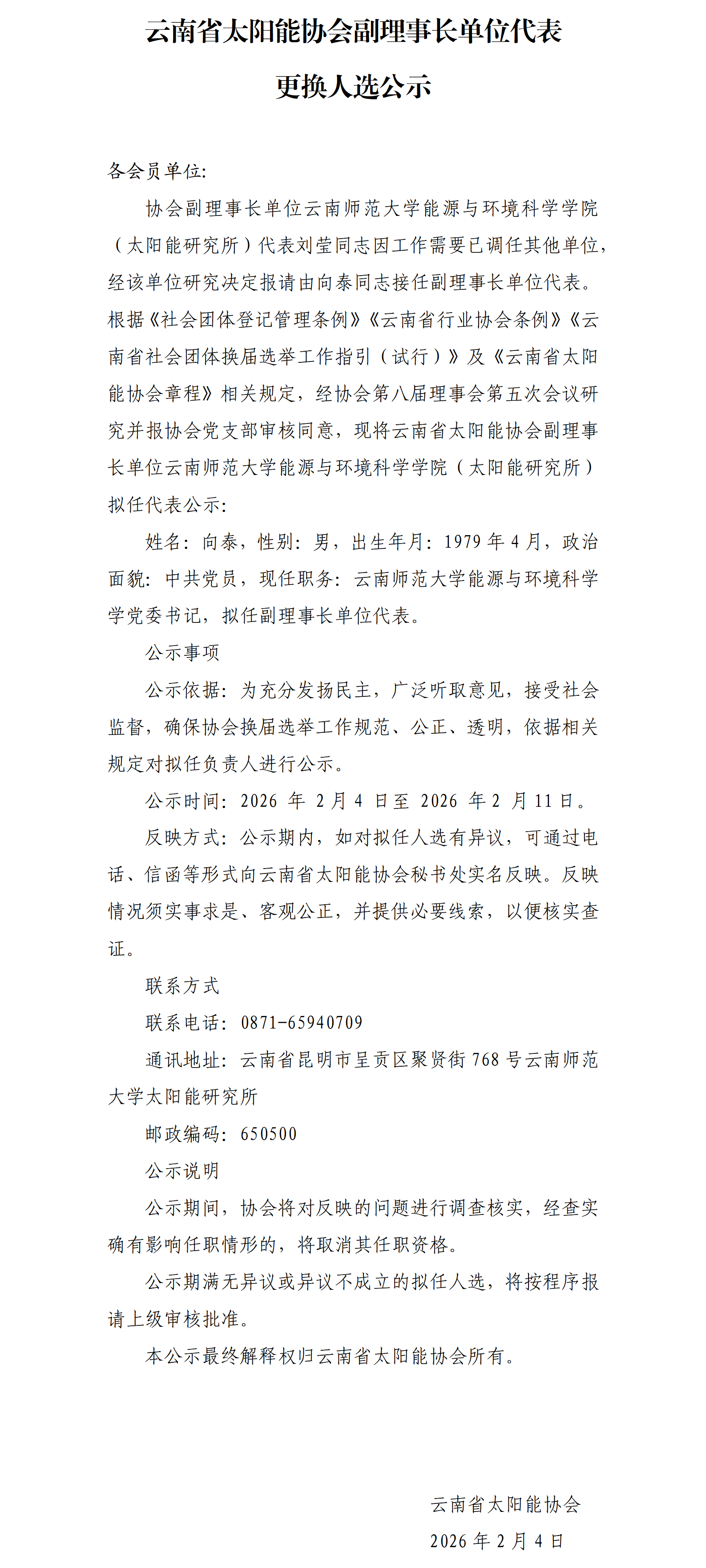 云南省太阳能协会副理事长单位代表更换人选公示
