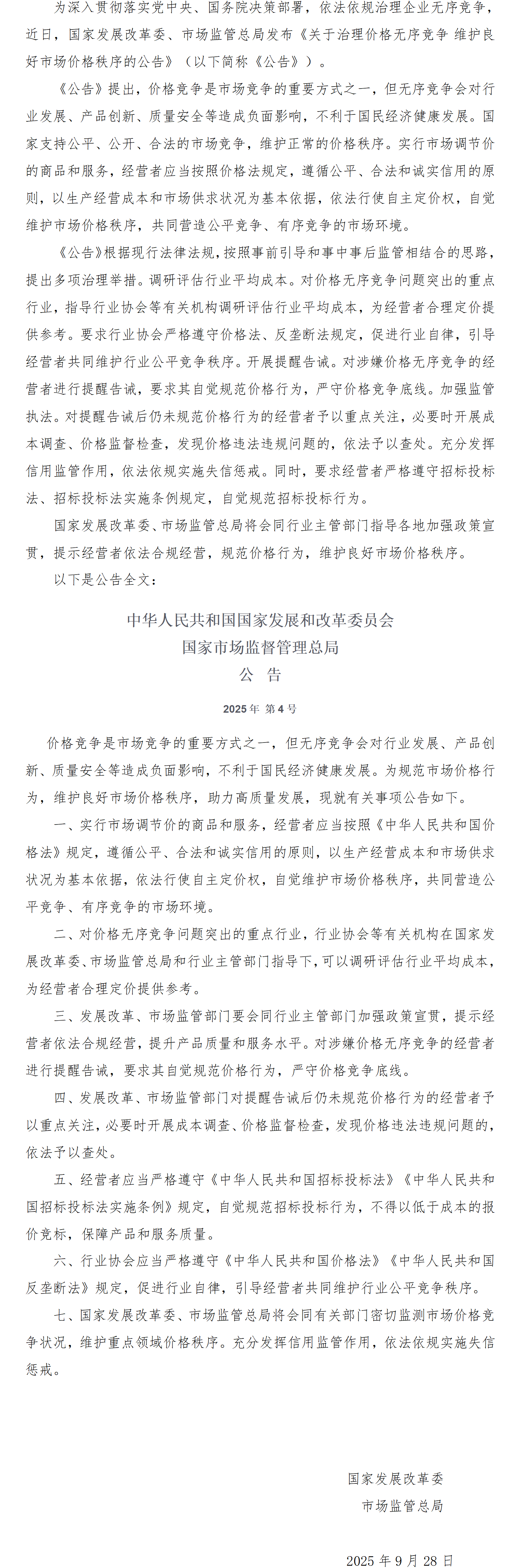 国家发展改革委、市场监管总局印发《关于治理价格无序竞争 维护良好市场价格秩序的公告》